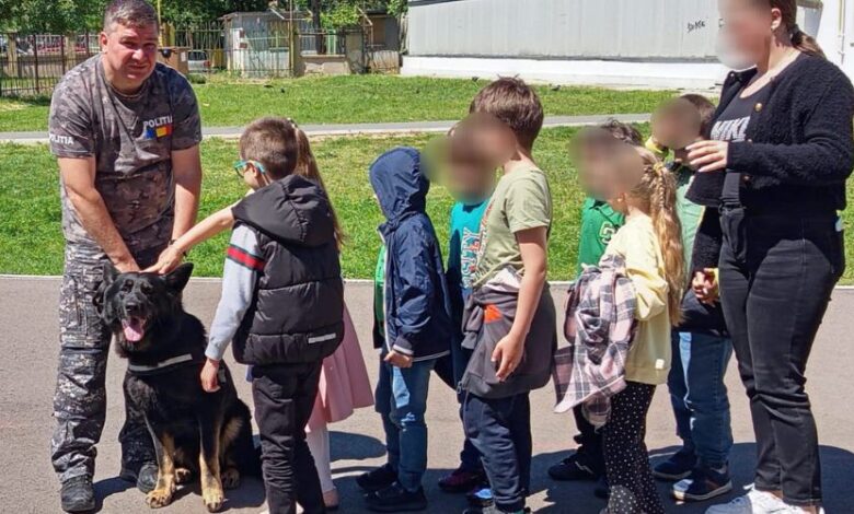 Prezent în mijlocul elevilor, Gipsy – câinele polițist – a fost copleșit de mângâierile și aplauzele copiilor, bucuros de misiunea primită.