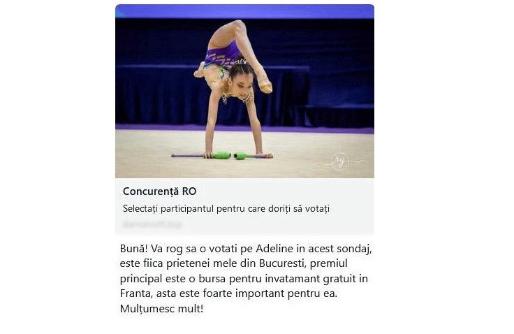 „Bună! Te rog să o votezi pe Adeline în acest sondaj. Este fiica prietenei mele, iar premiul este o bursă pentru studii în Franța. Mulțumesc mult!”