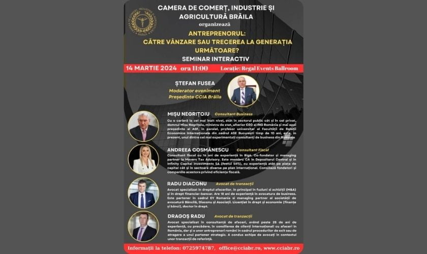 Camera de Comerț, Industrie și Agricultură (CCIA) Brăila organizează la data de 14 martie 2024, ora 11.00, la Regal Events & Ballroom, Bulevardul Independenței 282, municipiul Brăila, Seminarul interactiv „Antreprenorul: Către vânzare sau trecerea la generația următoare”.