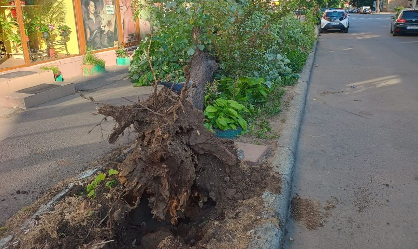 Pe Bulevardul Independenței, unul dintre arborii vechi, deja înclinat din cauza ploilor anterioare, a cedat complet sub forța vântului violent. Arborele s-a prăbușit peste trei autoturisme parcate, distrugându-le serios. Parbrize sparte, caroserii îndoite și zeci de curioși adunați în jurul dezastrului.