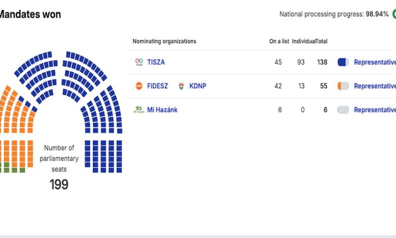 Potrivit rezultatelor oficiale parțiale, formațiunea condusă de Péter Magyar a obținut aproximativ 138 de mandate din totalul de 199, ceea ce îi asigură o majoritate de două treimi în Parlament – prag esențial pentru modificări constituționale și reforme instituționale de amploare.