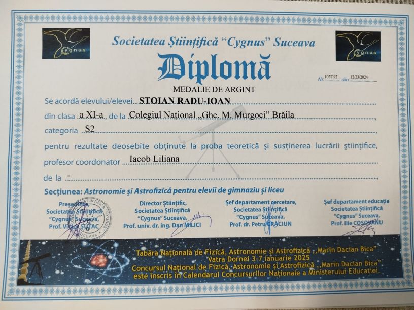 Astfel, în cadrul Concursului Național de Astronomie și Astrofizică „Marin Dacian Bica” pentru elevii claselor V-XII, Stoian Radu-Ioan a obținut o medalie de argint și o mențiune acordată de Ministerul Educației Naționale (MEN), iar Stoian Luiza-Maria a câștigat o medalie de aur și o mențiune MEN.